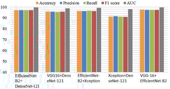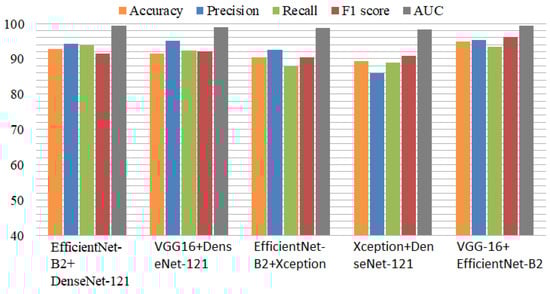 The performance comparison of the ensemble models is presented in Figure 5. Among the ensemble models, VGG-16+EfficientNet-B2 performed efficiently, with high performance metrics. The Xception model with Efficient-Net-B2 provided better results than the individual Xception model. Similarly, DenseNet-121 with VGG-16 performed with high accuracy for detecting Alzheimer’s disease. The experiments proved that the ensemble models provided excellent results compared to the individual models in terms of all performance metrics.