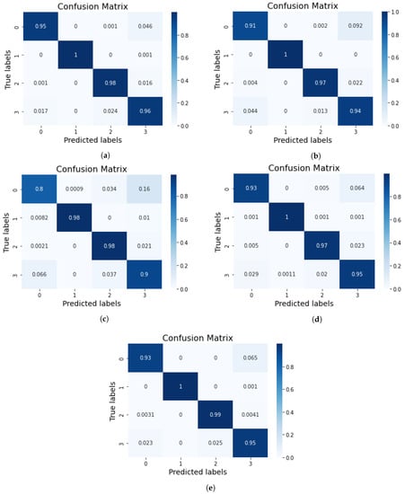 Results of confusion matrix for (a) VGG-16+EfficientNet-B2, (b) VGG-16+DenseNet-121, (c) Xception+DenseNet-121, (d) Xception+EfficientNet-B2, and (e) EfficientNet-B2+DenseNet-121.