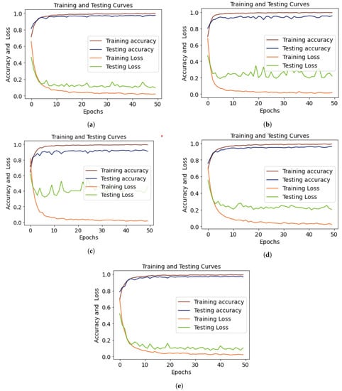 The training-testing accuracy and loss are displayed in Figure 8a. We observed that the training accuracy was 81.34 at epoch 1, and by epoch 10, we started to see variations in the data. We chose to train the ensemble deep learning models for 50 epochs, and we were able to improve their performance. Figure 8b shows the performance curves of the ensemble EfficientNet-B2+DenseNet-121 model, where the training accuracy was at its highest point at epoch 45 and the testing accuracy at epoch 37. The testing loss gradually decreased from epoch 1 to epoch 50. The testing loss for the ensemble VGG-16+DenseNet-121 model is displayed in Figure 8c. The curves of the testing and training accuracy started increasing from epoch 1. At epoch 43, the training accuracy reached 99.73 and the loss decreased from 0.68 to 0.01. Figure 8d,e shows that the testing loss for the ensembles of Xception+DenseNet-121 and Exception+EfficientNet-B2 was high compared to that in Figure 8a,b.