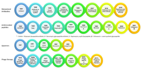 The history of discovery and time of approval of antimicrobial therapies (Figure 1) highlight phage therapy as a forerunner of other alternate therapies and a comparative analysis shows the four alternative therapies that have a synergistic effect to antibiotic treatment (Table 1).