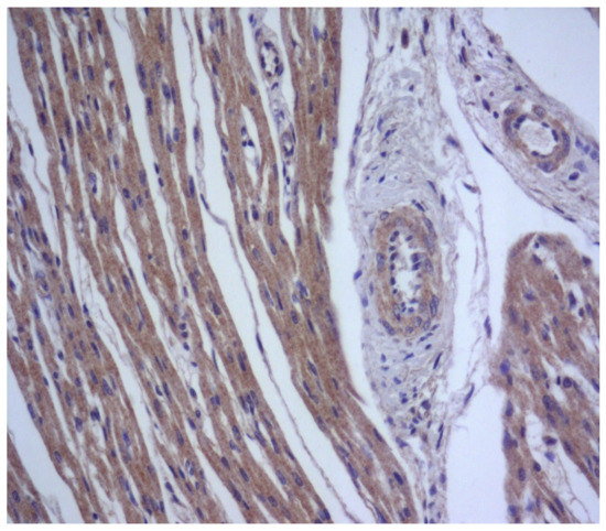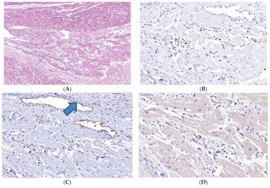 Importantly, infection with Coxsackie viruses upon myocarditis and dilated cardiomyopathy ranges from 73% to 82% and 38 to 75% of cases, respectively [53]. The expression of the virus-related VP-1 antigen in myocarditis is found in the cytoplasm of cardiomyocytes, endotheliocytes, vascular smooth muscle cells, fibroblasts, and inflammatory infiltrate cells (Figure 5).