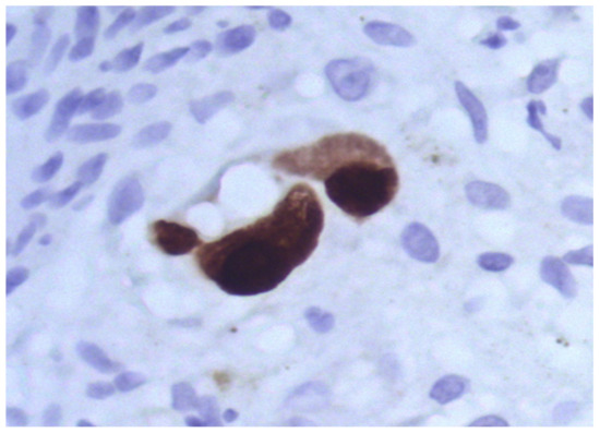 In parenchymal and non-parenchymal cells, herpes simplex virus antigens are expressed in the nuclei and/or cytoplasm. Similar to other herpes family viruses, cytomegalovirus displays a prominent pantropic behavior; however, cytomegalovirus-related damage to cardiomyocytes followed by relevant giant cell transformation occurs rarely, usually due to severe immunodeficiency [45]. Most often, cytomegalovirus-triggered heart lesions are limited to virus-induced alterations in the vascular endothelium (Figure 3) and parietal and valvular endocardium, as well as expression of virus-specific antigens observed in interstitial inflammatory infiltration and endothelial cells [46].