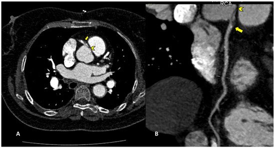 CCTA, curved planar reconstruction: (A) ascending aorta dissection involvement (arrowhead); (B) RCA ostial dissection can be noted (arrow).