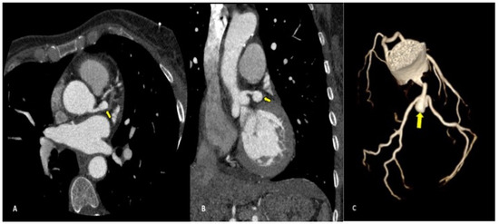Coronary pseudoaneurysms are relatively rare and can be caused by iatrogenic procedural trauma after PTCA or, more rarely, after coronary angiography. An aneurysm is defined as >1.5 times the normal arterial diameter, but pseudoaneurysms do not involve all layers of the vessel wall. Coronary pseudoaneurysms are mostly detected incidentally and are asymptomatic, but they can result in fistulae, rupture, bleeding, tamponade, and myocardial infarction; for these reasons, a prompt diagnosis is crucial [21], and CCTA allows for a correct definition of the size, morphology and location of the lesion.