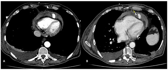 CCTA, axial planes, arterial-gated (A) and late non-gated (B) phases: medium-contrast blush can be noted in both arterial and venous phases with hemopericardium. In (B), the tip of the pericardial drainage catheter can also be noted (arrow).