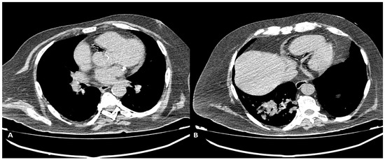 Complications encountered after PMK implantation represented 18.5% of all cases in the study. One patient only (0.03%) was scanned in the acute phase, less than 24 h after PMK positioning, presenting with acute chest pain, dyspnea, and laboratory signs of anemization. CTA was fundamental in determining management because it clearly demonstrated acute bleeding and a significant hemopericardium. Four other patients presented at CT observation more than 30 days after leads implantation had been performed. They reported chronic complications and aspecific symptoms such as intermittent chest pain and dyspnea [24,25,26]. CT imaging confirmed the clinical or echocardiographic suspicion of cardiac wall perforation caused by the edge of leads. In chronic cases, the amount of heemopericardium was mild, and no signs of active bleeding were shown by CTA. PMK leads in these cases always determined a buffering effect on the wall laceration.
