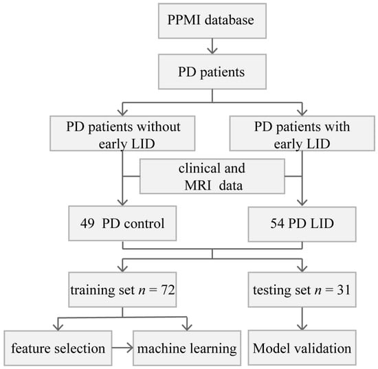 Data used in this article were obtained from the Parkinson’s Progression Markers Initiative (PPMI) database (www.ppmi-info.org accessed on 1 February 2022). The database provides researchers with open-access datasets and available biobanks, which can deepen the understanding of PD []. Since this study is based on an open-source database, written informed consent was waived. In this study, all 103 patients met the following criteria: (I) clinically diagnosed with PD; (II) treated with dopamine replacement therapy at baseline for at least 6 years; (III) had a follow-up period for more than 6 years; and (IV) completed the MRI examination at baseline. According to the score of UPDRS part IV, patients who developed LID in the first 6 years were assigned to the PD LID group (n = 54). In the PD control group, patients did not develop LID in the first 6 years of levodopa treatment (n = 49) (Figure 1). The age, years of education, MoCA score, depression assessment, levodopa equivalent dose (LEDD), duration of illness before levodopa treatment, reflexes assessment (REF), RBD questionnaire score, and total score of the Unified Parkinson’s Disease Rating Scale part III (UPDRS III) of the two groups were tested by Levene test and ANOVA analysis, the chi-square test was performed for gender. The duration of levodopa therapy before LID in the PD LID group was also evaluated.