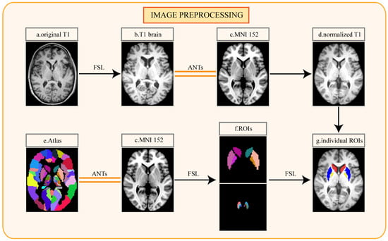 Pipeline for image preprocessing: (a) original T1-weighted MRI of individual patient; (b) T1 image after cranium removal; (c) Montreal Neurosciences Institute 152 (MNI152) standard space; (d) normalized T1 image; (e) automated anatomical labeling atlas 3; (f) the regions of interest segmented from the atlas; (g) the regions of interest segmented from the individual normalized image. FSL, the FMRIB Software Library; ANTs, Advanced Normalization Tools.