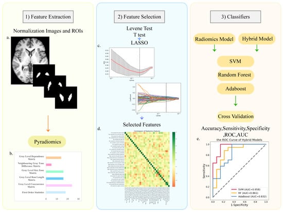 The process and main methods of constructing the radiomic models. There were three steps after image preprocessing: (1) feature extraction; (2) feature selection; (3) classifier construction. (a) The normalized T1 image and the masks of ROIs; (b) the types of radiomics features; (c) LASSO regression and variable filtering; (d) the correlation coefficient heatmap of selected features; (e) the ROC curve of hybrid models.