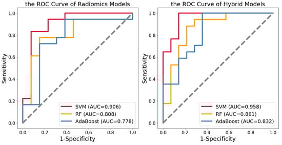 The ROC curves of the radiomics models and hybrid models in the testing set.