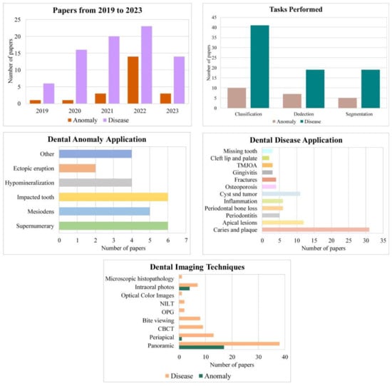 Figure 3 shows the distribution of publications by years, tasks performed, anomaly/disease applications, and dental imaging techniques. When the distribution of the number of publications in 2019–May 2023 is examined, the highest number belongs to 2022, with 14 anomalies and 23 diseases. Although 2023 (n = 17) is not yet finished, the number of publications is more than double the number of publications in 2019 (n = 7), and the number of publications has increased yearly. The most common task performed in diagnosing dental anomaly/disease is classification (n = 51). Another common task performed after classification is object detection in anomaly diagnosis (n = 7) and segmentation in disease diagnosis (n = 19). The most common diagnostic studies, mainly dental caries and plaques (n = 31) are on periodontal diseases (n = 23), cysts, and tumors (n = 11). Cleft lip and palate (n = 2), temporomandibular joint osteoarthritis (TMJOA), gingivitis, and missing teeth (n = 3) are the least researched diseases in the diagnosis of dental disease with deep learning. Apart from these studies, there are also studies on the diagnosis of inflammation, osteoporosis, and fractures. Since mesiodens are a type of supernumerary teeth, the most common type of anomaly in which deep learning methods are used for diagnosis is supernumerary teeth (n = 11). Other common types of anomalies examined were impacted teeth (n = 6), hypomineralization (n = 4), and ectopic eruption (n = 2). Three other anomaly applications in Figure 3 are diagnosing taurodont [64], maxillary canine impaction [48], and odontomas [46]. Another study is on the classification of ten different types of anomalies [47].