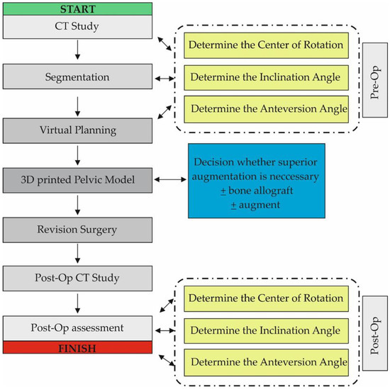 Hip revision surgeries are currently one of the most challenging procedures in orthopedic surgery. According to the data, the number of scheduled hip revisions will increase by 137% in the United States, England and Wales by 2030 [25]. In comparison to primary hip arthroplasty, this type of procedure carries a much higher risk of early or late complications: up to 40% [26]. The most significant include infection, dislocation of the endoprosthesis or loosening of its elements. Currently, 2D X-ray and/or 3D CT imaging of the hip joints are used in the preoperative planning process. On the basis of these diagnostic images and using the Paprosky classification system, the type and extent of bone tissue loss can be established. Consequently, an optimal acetabular cup and, if necessary, femoral stem can be chosen. It has been proven that accurate reconstruction of the center of rotation is a key element of this surgical procedure and guarantees the best early and late post-operative outcomes [1,18,19].