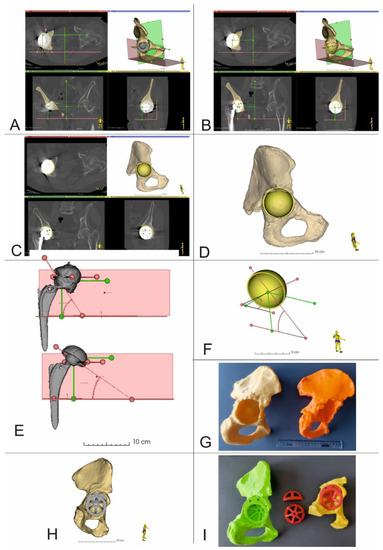 The virtual planning of the revision surgery was carried out in 3D Slicer 5.0.2. After determining the center of rotation together with the inclination and anteversion angles (Figure 4A), virtual planning of the RHA was performed. This process took into account the size and position of the acetabular cup, as well as the position of all the fixing screws. At first, the damaged acetabular cup was removed from the 3D model of the pelvis. The shape and dimensions of the resulting bone tissue defect were then estimated. Based on this analysis, an optimal revision acetabular cup size was determined. Then, a 3D model of the selected acetabular cup size was imported into 3D Slicer. This model was then virtually positioned within the planned implantation site, taking into consideration the center of rotation, inclination and anteversion angles (Figure 4B–D,F). After surgery and the acquisition of postoperative CT data, the position of the real acetabular implant was determined and compared to the location of the virtual 3D presurgical model (Figure 4D).
