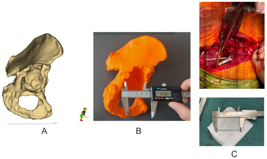 Analysis of the geometric dimensions of the 3D-printed models in relation to the anatomical features of the patient’s revision acetabulum was performed by measuring the length of the pelvic bone defect in the axial plane using an electronic caliper (0–150 mm × 0.01 mm) (Techsam-Quatros, Lublin, Poland) for the 3D models, whilst a rule prepared from K-wire and measured with a caliper during the revision operation. In addition, the virtual model was measured using the Markups module in the 3D Slicer 5.0.2 software (Figure 5).