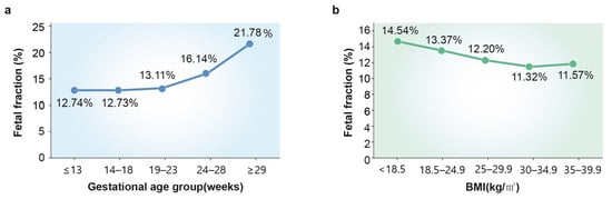 (a) Effects of gestational age on the percentage of fetal fraction. (b) Effects of maternal BMI on the percentage of fetal fraction. (Data source: Hum. Genomics 2019, 13, 62, https://doi.org/10.1186/s40246-019-0244-0 [46]).
