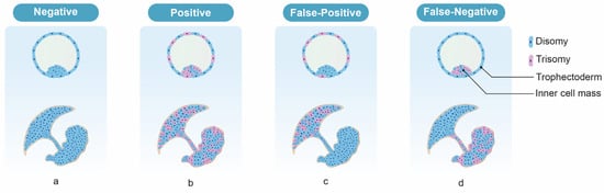 False-positive test results for NIPT may arise due to confined placental mosaicism (CPM) [47]. Since the primary source of “fetal” cfDNA in maternal circulation is placental cells (syncytiotrophoblasts), the cfDNA test is expected to provide results relevant to the placenta, which may be discordant with the actual fetal tissue. Previous CVS cases have shown that discordance may occur in 1–2% of pregnancies [47,48,49,50,51], and is more likely in cases with monosomy X and trisomy 13 than those with trisomy 21 or 18 [52]. True fetal mosaicism (TFM) can also result in false-negative cfDNA results (where the fetus is affected but cfDNA testing indicates no chromosomal abnormality). Although it is quite rare, false negatives in cfDNA results have been reported in Japanese data by a percentage of 0.01% [53]. In these cases, the fetus was chromosomally abnormal but cells with normal karyotype chromosomes existed on the villi [54]. Since the results of NIPT are determined by the relative proportions of cells with normal and abnormal karyotypes within the villi, mosaicism in which a high proportion of cells with normal karyotypes exist may produce a negative result. Since the NIPT result is negative, a definitive diagnostic test is not performed despite the fetus being chromosomally abnormal. In these cases, the cfDNA test results are considered analytically correct (i.e., detecting those placental cells of the mosaicism which are euploid) but clinically incorrect (i.e., the fetus itself is aneuploid) [55]. This kind of situation can occur for trisomy 13 and 18, but not trisomy 21 [56] (Figure 3).