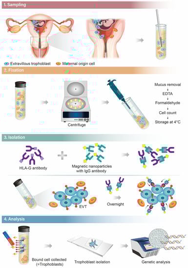 Once a successful sampling of the endocervical cells is achieved, another key step is the sorting of fetal cells (EVTs) from maternal cells. In the beginning era of TRIC studies, a micromanipulation isolation technique was used which sorted out cell clumps with the villous morphology of trophoblast cells [87,88]. Recently, a new method has been developed which utilizes the immunomagnetic isolation technique targeting the unique expression of HLA-G in EVTs, henceforth maximizing the purity of the isolation process [70,71,78]. Anti-HLA-G antibodies are incubated with magnetic nanoparticles that are conjugated to a goat anti-mouse immunoglobulin G (IgG) antibody (Figure 1) overnight at 4 °C. The next day, the collected endocervical cells are resuspended in PBS and mixed with the nanoparticle-attached HLA-G antibodies and incubated overnight again at 4 °C. Finally, the magnetic nanoparticle-bound cells, which are assumed to be EVTs, are separated from the non-bound cells (maternal cells) by using magnetic immobilization [89].