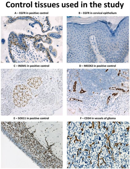 Positive controls used for immunohistochemical analysis: (A) Placenta cytotrophoblast and syncytiotrophoblast with distinct membranous staining for EGFR (EGFR immunohistochemistry, original magnification 200×); (B) Faint or absent immunoreactivity of EGFR in normal skin (EGFR immunohistochemistry, original magnification 200×); (C) Pancreatic isles positive for INSM1 (INSM1 immunohistochemistry, original magnification 200×); (D) High endothelial venules in MALT tissue of an appendix positive for MEOX2 (MEOX2 immunohistochemistry, original magnification 200×); (E) Neuronal precursors in the germinal matrix of fetal brain positive for SOX11 (SOX11 immunohistochemistry, original magnification 200×); (F) Blood vessels in glioma positive for CD34 (CD34 immunohistochemistry, 200×).