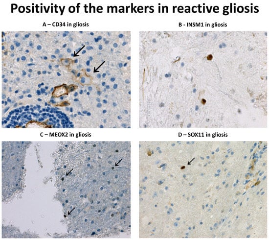 Positivity of the markers studied in reactive glial tissue: (A) CD34 immunoreactivity of scattered gemistocytes (arrows) in a sample of CNS DLBCL pretreated with glucocorticoids (CD34 immunohistochemistry, original magnification 400×); (B) Rare INSM1+ cells were observed adjacent to metastasis of carcinoma in one case (INSM1 immunohistochemistry, original magnification 400×); (C) Rare cells weakly positive for Meox2 in a tissue surrounding an AVM (MEOX2 immunohistochemistry, original magnification 400×); (D) Dispersed SOX11+ cells were observed in several reactive condition, like in a case of carcinoma metastasis (SOX11 immunohistochemistry, original magnification 400×).