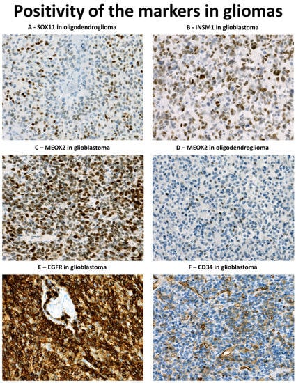 In the past, several proteins were identified with differential expression in embryonal brain and/or tumour tissue when compared to the normal adult brain. This includes epidermal growth factor receptor (EGFR), a transmembrane receptor protein localised on chromosome 7 that is expressed in neural stem cells of subventricular zone [9] and in a subset of glioblastomas with EGFR gene amplification or mutation [5]. EGFR signalling promotes glioma cell survival, proliferation, and migration by an activation of PI3K/Akt or MAPK signalling pathways [10]. Another protein, mesenchyme homeobox 2 (MEOX2), is often overexpressed in glioblastomas. Similar to the EGFR gene, MEOX2 is localised on chromosome 7, and gains of chromosome 7 can, in part, explain its expression in a subset of tumours [11]. The literature on MEOX2 in glioblastomas is scarce; however, there are data that indicate that MEOX2 functions as a transcription factor involved in the regulation of viability, proliferation, and differentiation of glioma cells by interacting with PI3K/Akt and MAPK pathways [12]. INSM1 and SOX11 are other transcription factors. Both are necessary for normal neurogenesis in the embryonal and adult brain [13,14,15]. INSM1 is not detected in the adult brain tissue samples but it is present in some gliomas [16]. Under normal conditions, INSM1 expression is seen in a subset of neuronal precursors in basal zones of neuroepithelium, where it is responsible for positive regulation of cell proliferation [17]. In gliomas, however, its role is not well understood. SOX11 is a transcription factor necessary for sustained proliferation of neural progenitor cells (NPCs), acting by upregulation of Nmyc transcription factor [14]. SOX11 was detected in various proportions of gliomas [18,19] and there are data suggesting a positive correlation between SOX11 expression and patient survival [18], possibly as a result of plagl1 protein inhibition and induction of cell differentiation [20]. Lastly, CD34 is a transmembrane glycoprotein involved in cellular adhesion [21]. In the normal brain, CD34 is not detectable; however, it is commonly positive in low grade glioneuronal tumours and malformations associated with epilepsy and in a subset of glioblastomas [22,23].