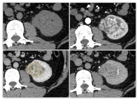 Representative case of segmentation for a clear cell renal cell carcinoma (ccRCC). A 55-year-old man with a demarcated, well-defined, homogenous tumor, with a regular calcification, diagnosed as a ccRCC, at multiphasic contrast-enhanced CT scan: unenhanced (upper left), arterial (upper right), nephrographic (lower left) and excretory (lower right) phases. Red outline represents tumor segmentation.