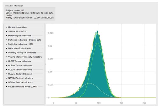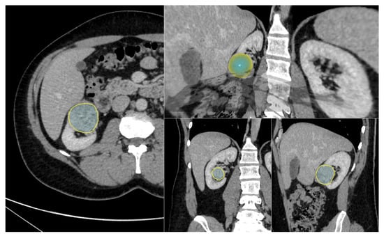 All Digital Imaging and Communication in Medicine images were anonymized. Segmentation was performed by C.G. using SOPHiA DDM for Radiomics v2.1.21 (SOPHiA GENETICS, Saint-Sulpice, Switzerland). In accordance with previous studies, nephrographic phase images were segmented due to their favorable tumor/renal parenchymal contrast. First, the slice on which the tumor was clearest (axial, coronal or sagittal plane) was chosen, and the tumor contours were precisely drawn by hand. Next, a volumetric model of the tumor was constructed using a deformation algorithm. If necessary, the user could manually adjust the semi-automatically obtained contours of the lesion. Each 3D segmentation process took approximately 20 min. The user interface of the segmentation software is shown in Figure 3.