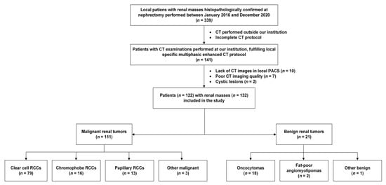 A total of 122 patients were included who were surgically treated at our institution between January 2016 and December 2020 (Figure 5). Overall, two had two renal tumors, one had three renal tumors, and one had seven renal tumors; therefore, there were 132 renal lesions in total. There were 111 RCCs: 79 ccRCCs, 16 chRCCs, 13 pRCCs and 3 other rare renal carcinomas. There were also 21 benign lesions: 18 oncocytomas, 2 fat-poor angiomyolipoma (fpAMLs) and 1 other rare benign renal tumor.