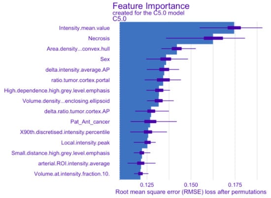 Plot graph of variables involved in prediction model. The 15 most important features in tumor classification were plotted on the graph in order of their importance. The variable that played the most important role in prediction was “intensity mean value”, which corresponds to the average value of the intensities observed in the volumic segmentation at the portal time.