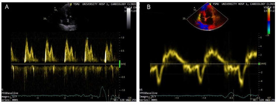 Currently, echocardiographic Doppler and TDI are widely used in clinical practice for the evaluation of LV systolic and diastolic functions. As a marker of diastolic dysfunction, LV filling pressure can be assessed by calculating the E/e’ ratio, where the E wave is the peak velocity of the early diastolic flow across the mitral valve, as measured by pulsed-wave Doppler, and e’ is the early diastolic velocity of the septal or lateral mitral annulus obtained by TDI (Figure 1). The accepted threshold for the normal LV end-diastolic pressure is E/e’ <8, while E/e’ >14 and peak tricuspid regurgitation (TR) velocity >2.8 m/s indicate high LV end-diastolic pressure [33]. Recent studies emphasize the importance of the routine measurements of E/e’ for the assessment of LV filling pressure, risk stratification, and prognostication in the HF patient population [33,34]. Benfari G. et al. suggested an E/e’ ratio >14 as a cut-off for the identification of high-risk patients [35]. The authors reported increased short- and long-term mortality in individuals with E/e’ >14, with a considerable worsening of prognosis in E/e’ >20 [35]. Therefore, in HFrEF, additional parameters should be considered for the assessment of LV filling pressures and atrial hypertension to predict intracardiac volume overload and subclinical deterioration.
