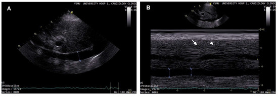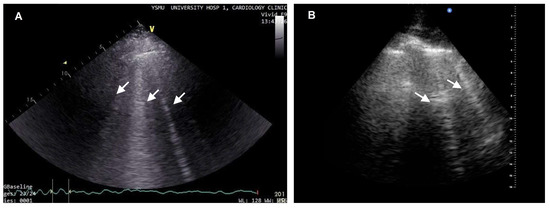 In healthy lungs, only horizontal parallel A-lines can be observed. In the case of extravascular fluid accumulation in the lungs, B-lines can be detected, which are vertical white artifacts arising from the pleura and reaching the bottom of the screen (Figure 2) [55]. LUS can be performed in the supine position of the patient in 28 areas and the total number of B-lines is reported [55]. Progressive increase in B-lines is associated with the severity of pulmonary congestion, the total number of B-lines >5 in 28 zones is considered abnormal, while B-lines >30 suggest severe congestion [55,56].