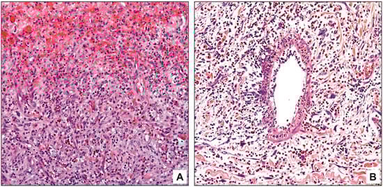 Eosinophils in acute cholecystitis. Eosinophils are often in the hemorrhagic foci (A). In some cases, secondary vasculitis by eosinophils is also observed (B).