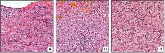 Although eosinophilic cholecystitis was first defined in two acalculous patients [] and has been reported to manifest more frequently in acalculous cholecystitis than in cholelithiasis in some studies [,,], even up to three times [], concomitant gallstone reports are also present. A retrospective analysis of 7494 cholecystectomy specimens revealed that 12 patients (0.2%) were diagnosed with eosinophilic cholecystitis, and all of them had gallstones []. In another retrospective study of 1370 cholecystectomy specimens, eosinophilic cholecystitis was diagnosed in 22 (1.6%) patients, and gallstones were present in most patients []. In our cohort, this condition often occurred in association with gallstones; however, half of the cases with more diffuse gallbladder involvement lacked gallstones. Therefore, it is possible that in some cases, an inherent predisposition rather than a process triggered by cholelithiasis may be at play.