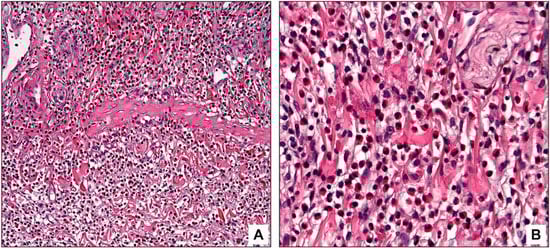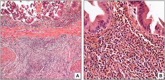 An entity designated “eosinophilic cholecystitis” is recognized as a distinct type of cholecystitis [,]. Since its first description in 1949 [], it has been reported in a limited number of case series [,,,,,,], with an incidence ranging from 0.02 to 6.4% of cholecystectomies [,,,]. Being clinically indistinguishable from the other types of cholecystitis, the diagnosis of eosinophilic cholecystitis is primarily histological and performed via analysis of the cholecystectomy specimen []. However, the term eosinophilic cholecystitis has been used variably, and there has been no uniform definition for the pattern of injury or characterization of its clinicopathologic associations. Some investigators have defined eosinophilic cholecystitis based on the density of eosinophils [,], while others have also considered which gallbladder layers are involved as part of the diagnosis [,,,]. More importantly, although eosinophils are known as participants in some phases of acute cholecystitis [,,,], most of the case reports and series have included subacute cases as eosinophilic cholecystitis as well [,,,], and some authors have employed the term in the setting of chronic cholecystitis [].