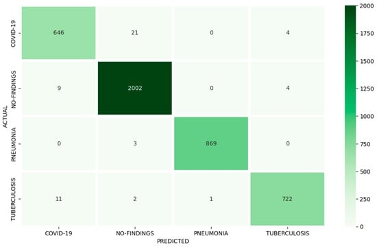 | Actual | COVID-19 | No-Findings | Pneumonia | Tuberculosis | Correctly Classified |
