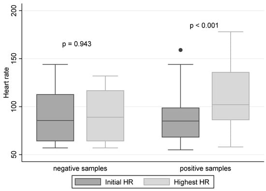 Figure 2 compares the dogs’ initial heart rates and the maximum heart rates in the rounds, presenting heart rates separately for positive and negative samples. It is obvious that while the HR did not change significantly (p = 0.94) during rounds containing only negative samples, a significant change (p < 0.001) was observed when a positive sample was present in the sample set.