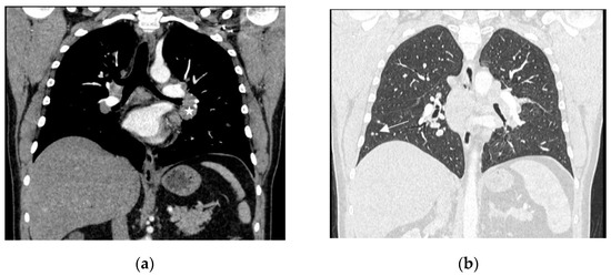 Computed tomography of the chest, with contrast enhancement, coronal plane, mediastinal window (a), lung window (b). Enlarged mediastinal and hilar lymph nodes ((a)—white asterisk). Small nodules in the right lower lobe ((b)—white arrow).