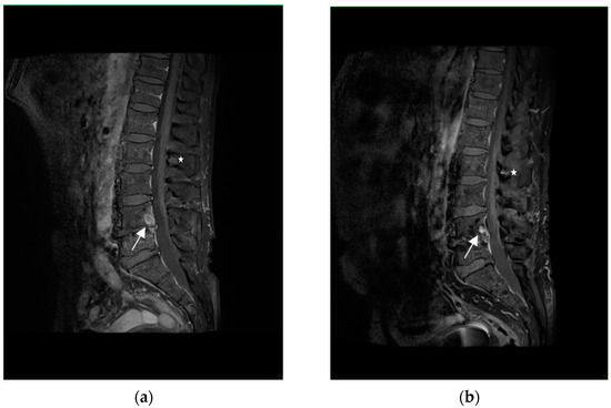 T1-weighted images with fat saturation and with gadolinium contrast administration, sagittal plane. Contrast enhanced lesion in L4 vertebral body ((a)—white arrow) has reduced its size ((b)—white arrow). Similarly, the lesion in the spinous process L2 ((a)—white asterisk) has decreased in size ((b)—white asterisk).