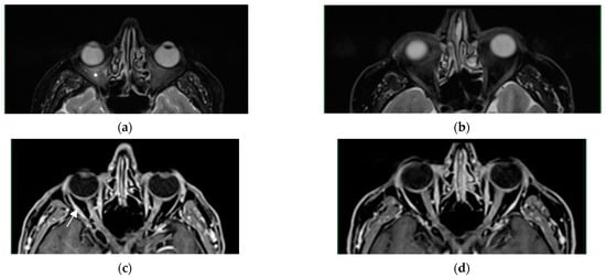 T2-weighted images with fat saturation, axial plane—(a,b). Moderate edema of the intraconal fat secondary to optic neuritis ((a)—white asterisk). Resolution of edema on follow—up examination (b). T1-weighted image with gadolinium contrast administration, axial plane—(c,d). Heterogeneous optic nerve enhancement, more significant on the right side ((c)—white arrow). Marked partial regression of lesions on follow-up examination (d).