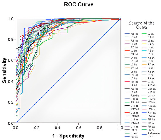ROC—curves plotted from temperature values at all points under study. The curves generated by the temperature value on the surface of the body (for example, L1sk) and the temperature value in the depth of the body (for example, R1int) are presented. There is the “1—Specificity”—proportion of incorrectly classified negative cases. “Sensitivity”—proportion of correctly classified positive cases (people with pneumonia).