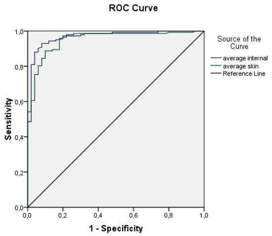 Variable(s): average_internal, average_skin, sex, age. The data was adjusted by gender and age. Cox & Snell R Square = 0.562, Nagelkerke R Square = 0.864, Chi-square for final model 158.71. Hosmer-Lemeshow test, Chi-square = 79,291, p = 0.000.