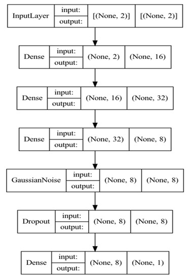 For a deep neural network, the following architecture was chosen, shown in Figure 5. In addition to the input and output layers, four hidden layers were used with additive zero-centered Gaussian noise and dropout to avoid overfitting. The third vertical block on each layer represents the input dimension, fourth—output dimension. “None” represents a dynamic dimension of a batch.