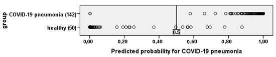 The figure shows that the resulting equation identifies patients with COVID-19 pneumonia and healthy people quite well.