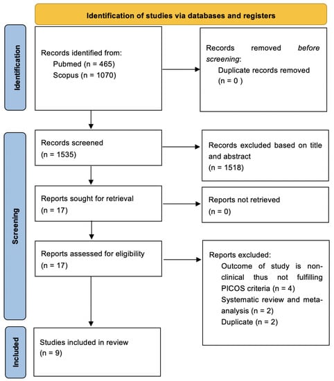 The database searches yielded 465 articles and 1070 articles from PubMed and Scopus, respectively. The 1535 articles were independently screened based on the title and abstract, which excluded 1518 articles. Seventeen articles were retrieved for full-text screening. A total of eight articles were further excluded. Four out of the eight articles were excluded after full-text screening due to unmet PICOS criteria. These four articles did not include the clinical outcome of the study and did not match our inclusion criteria for the present study. Two of the eight articles were systematic reviews and meta-analyses, and two out of the eight articles were duplicates. Therefore, nine articles were selected in the present study, which fulfilled our PICOS. The details of the selected studies are presented in Figure 1.