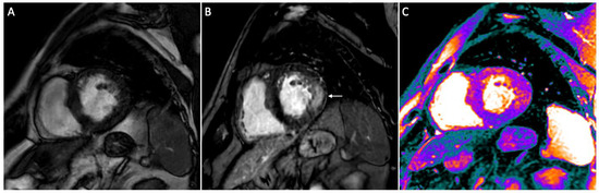 T1 mapping is a relatively recent established and reproducible CMR technique aimed at characterizing myocardial tissue [26]. In particular, native T1 mapping estimates the intrinsic longitudinal relaxation time of the myocardium tissue without administration of a contrast agent [27]. Assessment of myocardial T1 can be performed using sequences that require one short breath-hold per slice, with native T1 being higher in fibrosis, edema and amyloid accumulation and lower in iron overload and focal fat infiltration [28]. The quantitative T1 signal from the myocardium is analyzed pixel-by-pixel and post-processed to derive a colored map of the myocardium in which the different T1 values are represented by different colors [29]. Therefore, native T1 mapping with CMR may be useful to assess early cardiac involvement of AFD and distinguish this latter from other causes of LVH [30]. A lowering of the native T1 values can be given by the overload of glycosphingolipids in the initial stages of the disease, anticipating the subsequent development of LVH and myocardial dysfunction; however, the influence of the demographic characteristics of the patients and the imaging acquisition protocols used must be considered [31]. Of note, to distinguish iron overload and focal fat infiltration, both of which exhibit low myocardial T1 values, quantifying T2* can be instrumental. Specifically, a T2* value greater than 20 msec indicates the absence of cardiac iron overload [32].