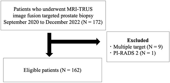 Of the 172 patients who underwent MRI-TRUS image fusion-guided TB, 162 eligible patients were enrolled in the study (Figure 1).