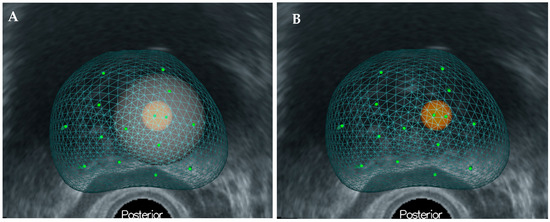 (A) Three-dimensional-mapping of prostate using KOELIS Trinity®. (B) The perilesional target is defined as the site within 10 mm of the region of interest.