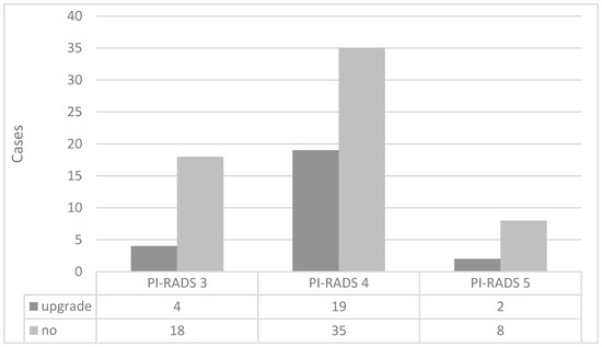 On the other hand, among the patients classified as “no,” there were 11 cases in the PI-RADS score 3 group whose GG matched between their TB and pTB, while 7 cases showed downgrading in their pTB compared to TB. In the PI-RADS score 4 group, 13 of 35 patients had downgraded GG in their pTB compared to TB, while none of the patients with PI-RADS score 5 had downgraded GG in their pTB.