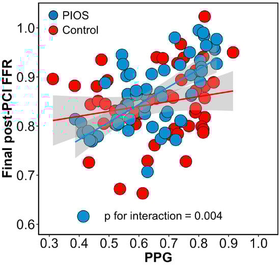 Data are expressed as mean ± SD and median (interquartile range) for normally and non-normally distributed data, respectively. Categorical variables are expressed as frequencies and percentages (%). Continuous variables were compared using Student’s t-test (or Mann–Whitney tests as appropriate), and categorical variables were compared using the Chi-square test (or Fisher’s exact test as appropriate). Differences across the groups were compared with the Kruskal–Wallis H test. Predictors of the post-PCI FFR value were assessed using univariate and multivariate regression analyses. The variables included in the multivariate analysis were selected based on their known association with final post-PCI FFR [,]. Formal interaction testing was performed between the randomization arm (PIOS or controls) and the PPG for the outcome of post-PCI FFR. Receiver operating characteristic (ROC) curve analyses were used to assess the capacity of the residual PPG for predicting final post-PCI FFR ≥ 0.90. All analyses were performed in the intention-to-treat population in patients with pre-PCI FFR pullbacks suitable for PPG calculation. A two-sided p-value of 0.05 or less was considered statistically significant. All statistical analyses were performed with R statistical software (R Foundation for Statistical Computing, Vienna, Austria).