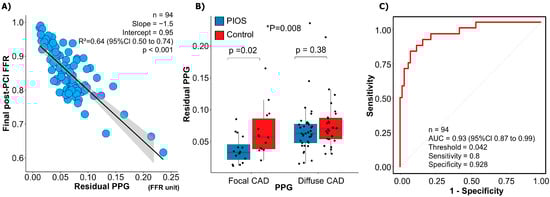 The mean residual diameter stenosis was 15.0 ± 8.8%, and there was no difference between focal and diffuse CAD (16.0 ± 9.9% focal vs. 14.5 ± 8.2% diffuse; p-value = 0.41) or between PIOS and controls (14.5 ± 9.2% PIOS vs. 15.6 ± 8.4% control; p-value = 0.50). The mean residual PPG derived from post-PCI FFR pullbacks was 0.07 ± 0.04. The residual PPG conditioned final post-PCI FFR (R2 = 0.64, 95% CI 0.50 to 0.74, p < 0.001; Figure 4A). The residual PPG was not significantly different between patients randomized to PIOS versus controls (0.06 ± 0.04 PIOS vs. 0.07 ± 0.04 controls; p-value = 0.06). However, patients with focal CAD randomized to PIOS had the lowest residual PPG (0.04 ± 0.02 focal PIOS vs. 0.07 ± 0.04 focal control, 0.07 ± 0.04 diffuse PIOS vs. 0.08 ± 0.04 diffuse control; ANOVA p-value = 0.008; Figure 4B). The residual PPG predicted final post-PCI FFR ≥ 0.90 with an AUC of 0.93 (95% CI: 0.87–0.99; p < 0.001; Figure 4C).