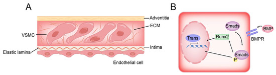 Structure of vessel wall and BMP pathway of VSMC osteogenic transformation. (A) VSMCs are distributed in the ECM and separated from endothelial cells by elastic lamina. (B) In the BMP pathway, BMP activates the osteogenic gene of VSMC directly or indirectly by activating Smad protein.